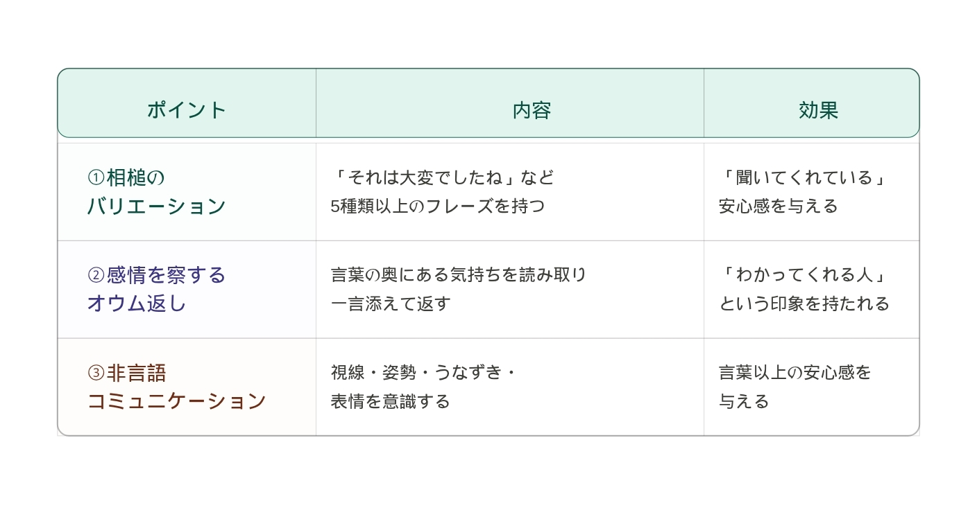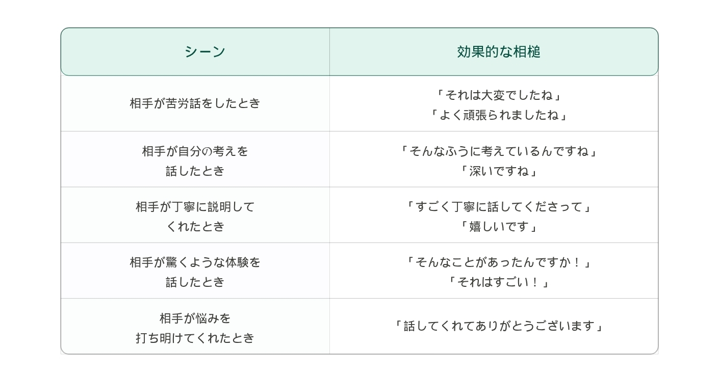 このように相槌の種類を増やすだけで、会話の雰囲気が一気に温かくなります。