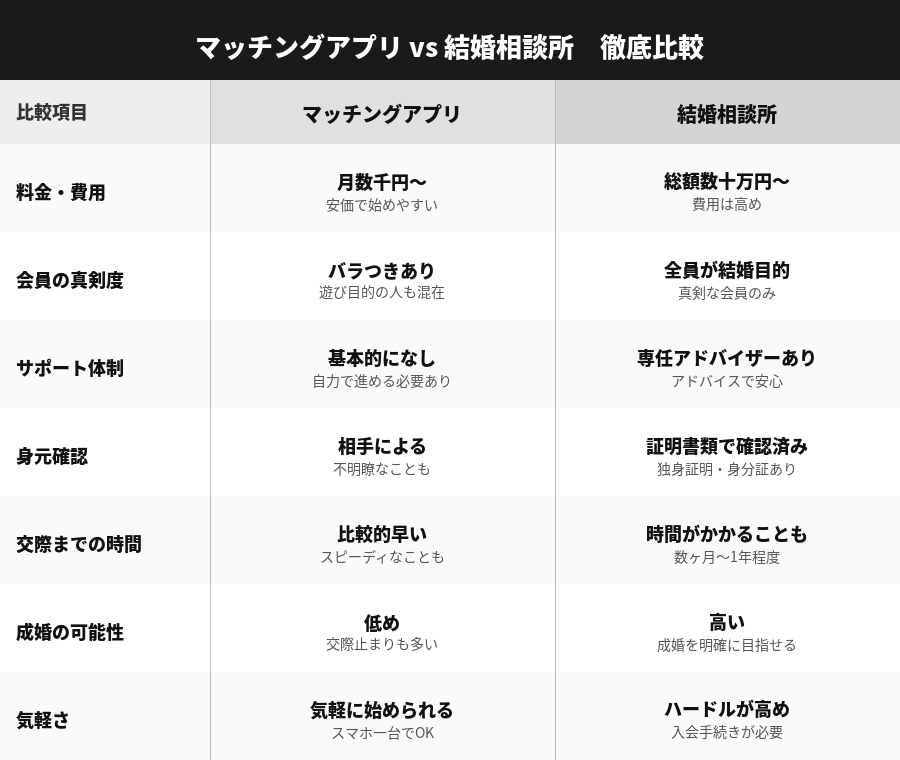 マッチングアプリであれば月額数千円から始められるため、費用面のハードルの差は歴然としています。
